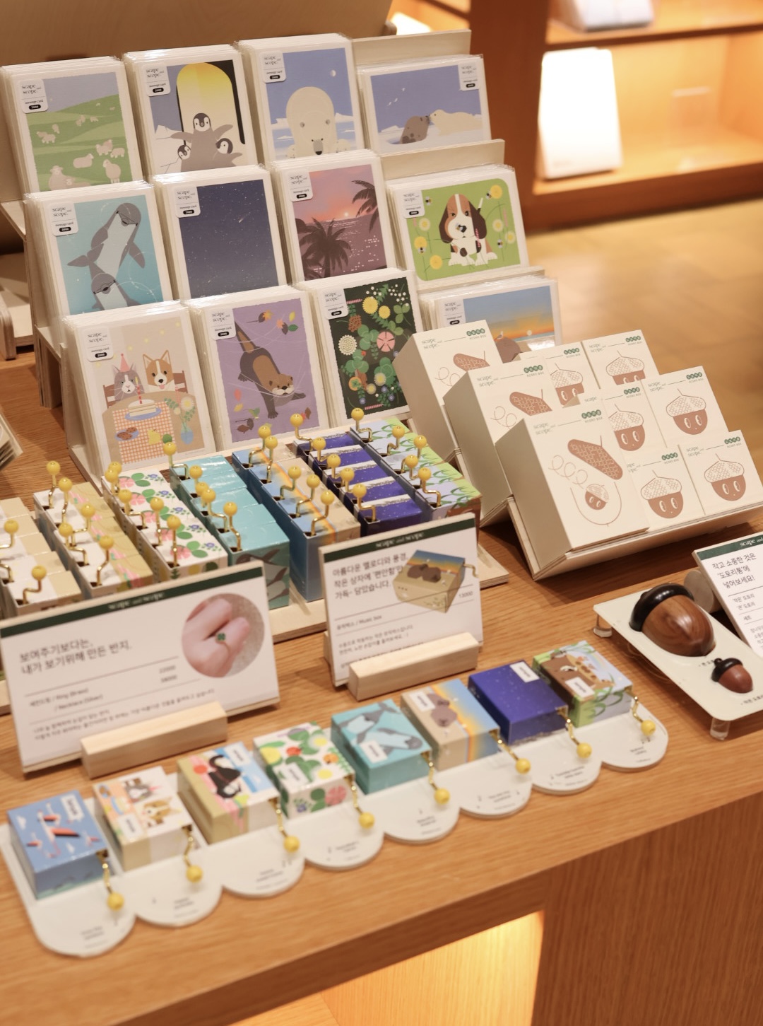 더 리버몰은 '이케아 강동점'이 함께 입점해있어 찾아가기 쉬울 거에요. 아크앤북은 몰 5층이고, 스케이프 앤드 스코프는 입구에서 가까운 곳 평대에 있습니다. 제품 구성은 사진을 참고해주세요. 신제품 책갈피 카드와 마그넷 프레임도 진열해 두었고, 사진에는 보이지 않지만 2세대 성게램프와 가리비램프, 그리고 A5사이즈의 미니포스터도 만날 수 있습니다! : )
