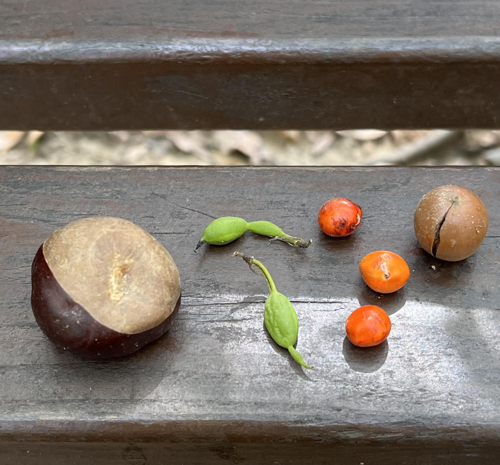 (좌측부터 순서대로) 칠엽수 열매, 회화나무 열매, 목련나무 열매, 신갈나무 열매.