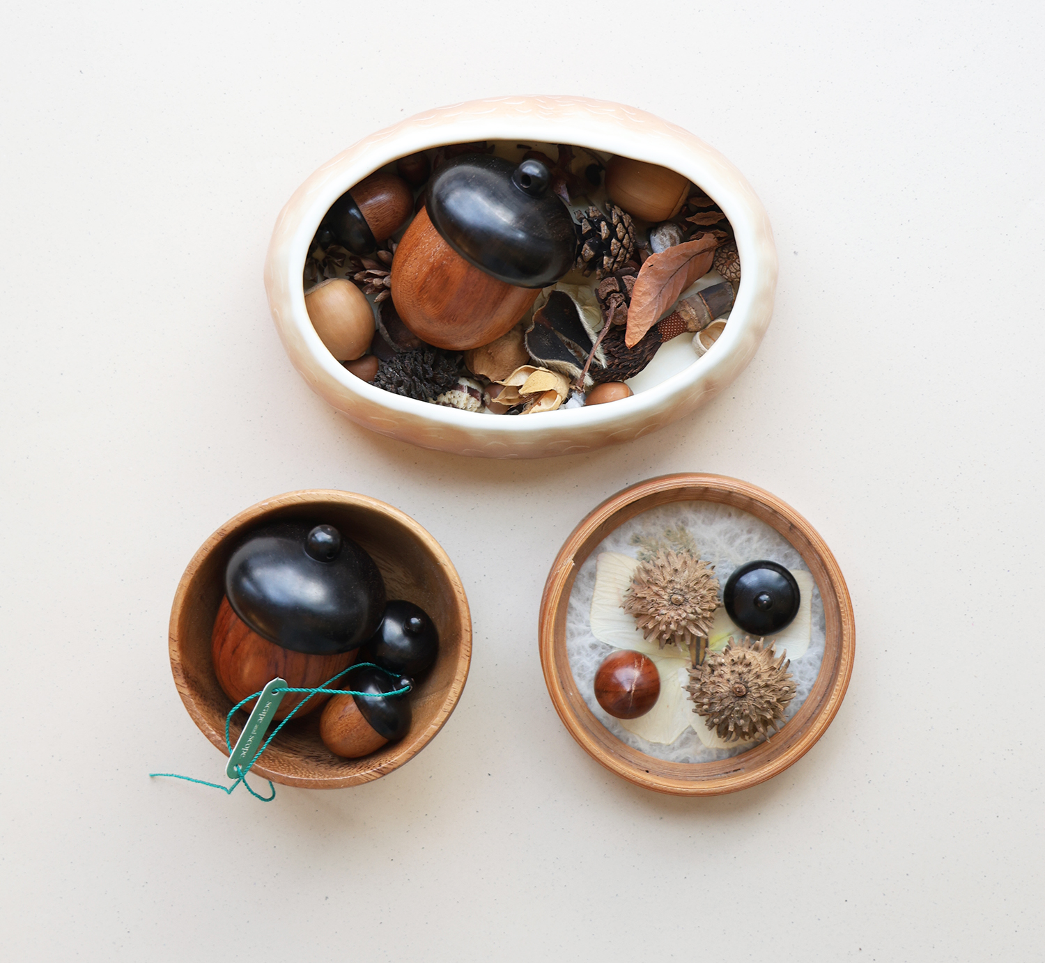 사실 이 제품은 아주 오래 전부터 품은 개인적인 마음에서 출발했습니다. 도토리나 호두, 땅콩과 같은 견과류의 껍데기에 잔뜩 매료된 때가 있었습니다. 소중한 씨앗을 담기 위해 나무들이 만든 저마다의 독특하고 실용적인 작은 상자. 세상에 이것보다 멋진 통은 없을 것 같았습니다. 호두, 도토리, 은행을 반 가르고 그 껍데기를 다시 끈으로 묶어 보물상자로 쓰기도 했지요. 도토리통은 이 귀여운 숲속의 보석함들을 나도 모으고, 쓰고 싶다는 다람쥐와 같은 마음에서 시작했습니다➿🐹