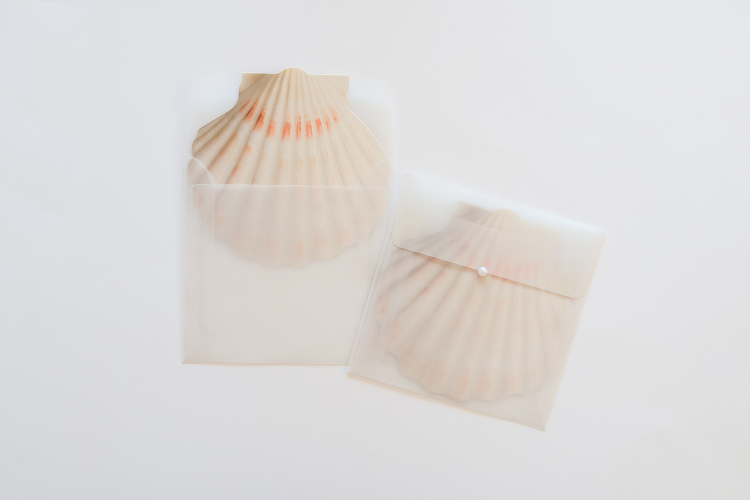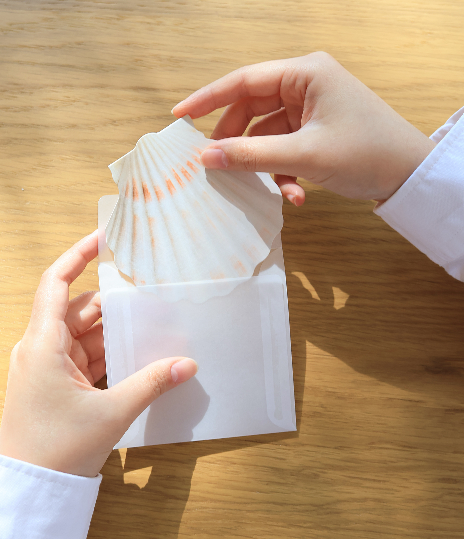카드는 300그램 이상의 도톰하고 부드러운 종이를 사용했습니다. 가리비가 은은하게 비치도록 반투명종이로 만든 봉투가 함께 들어있습니다.