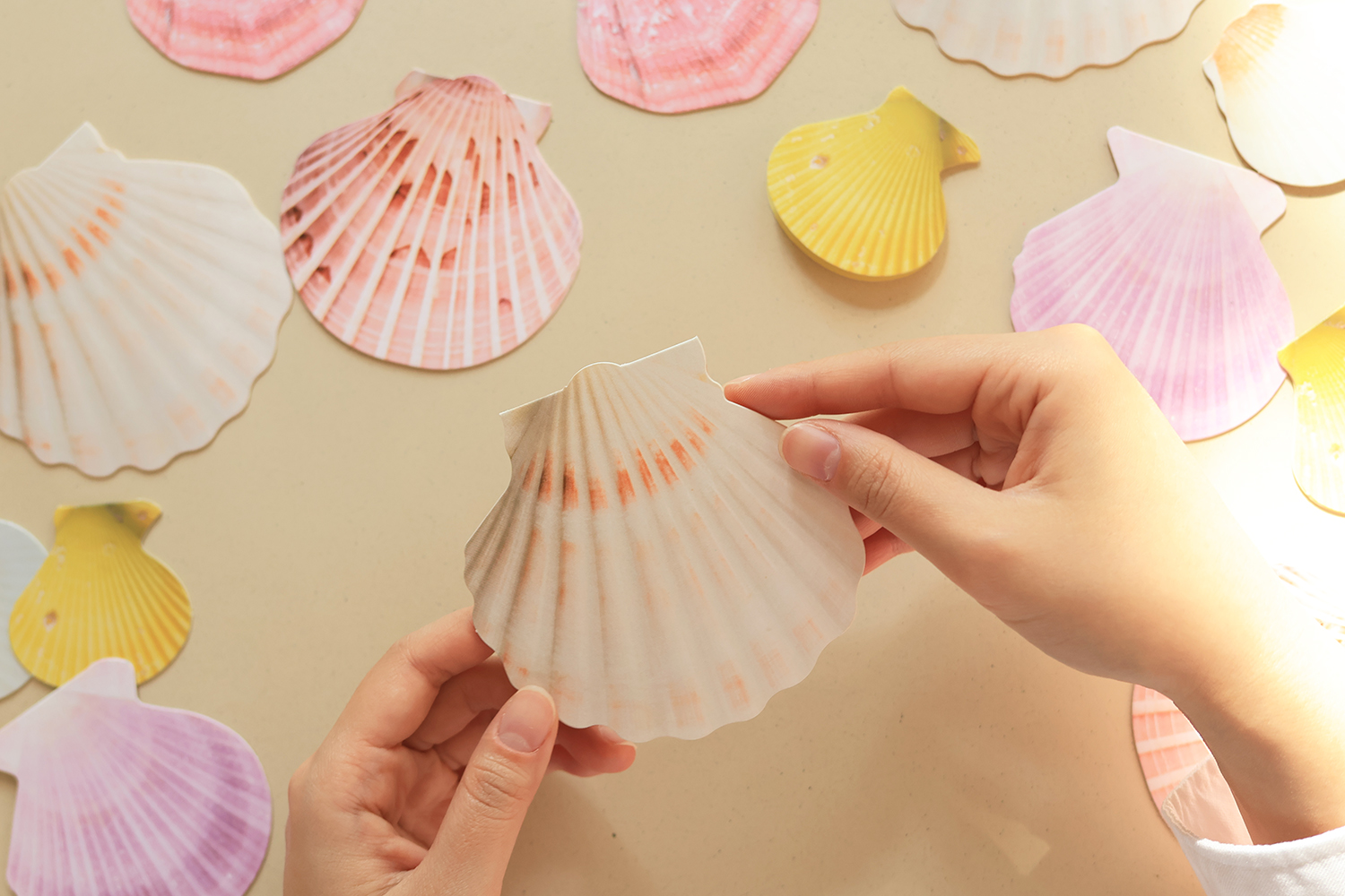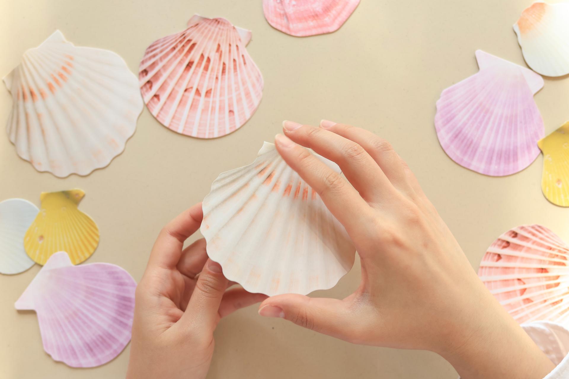 5센티미터부터 10센티미터까지. 크고, 작고, 알록달록하고, 저마다의 패턴으로 빛나는 가리비 껍데기를 카드로 만들었습니다.