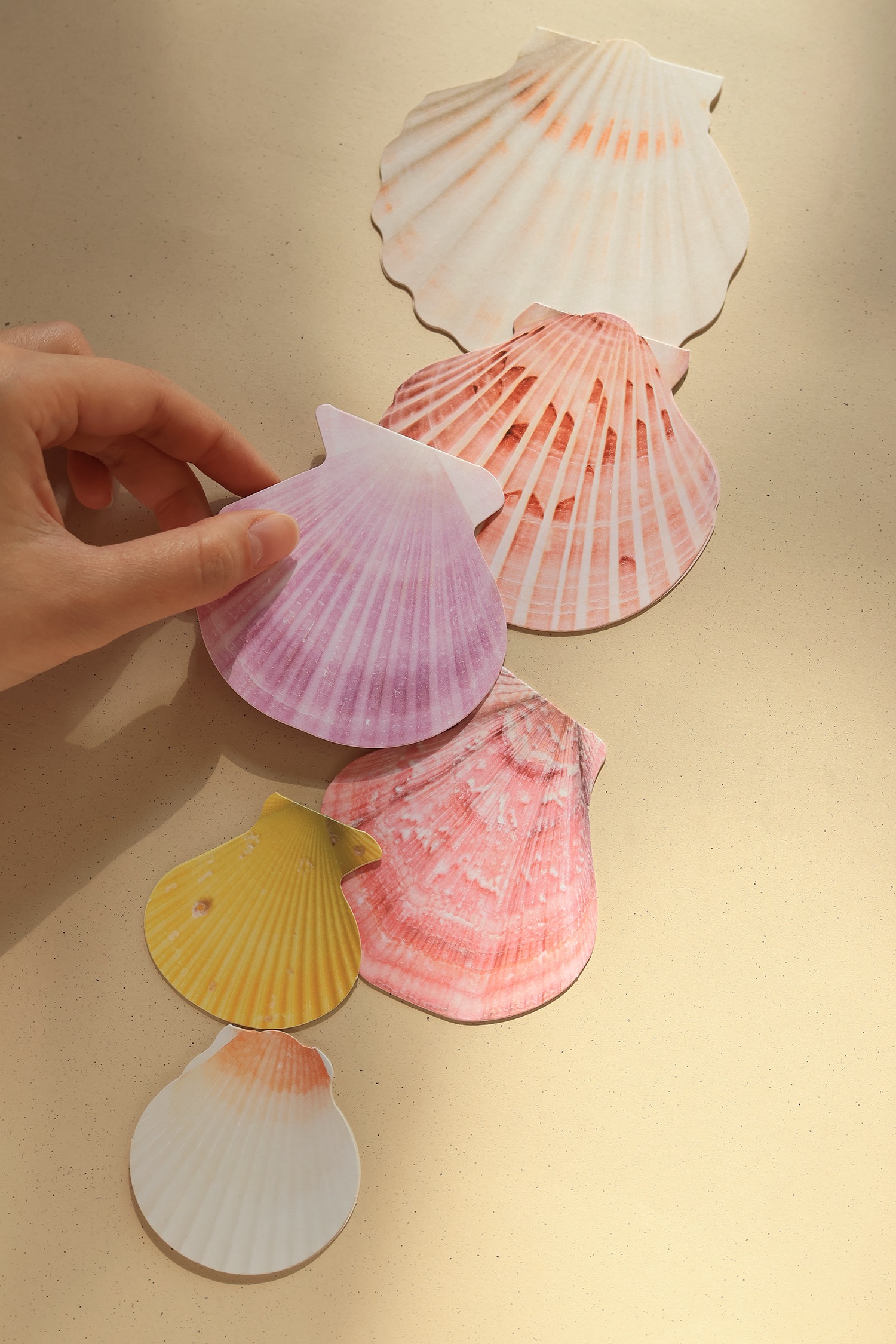 크고, 작고, 알록달록하고, 저마다의 패턴으로 빛나는 가리비 껍데기를 카드로 만들었습니다.