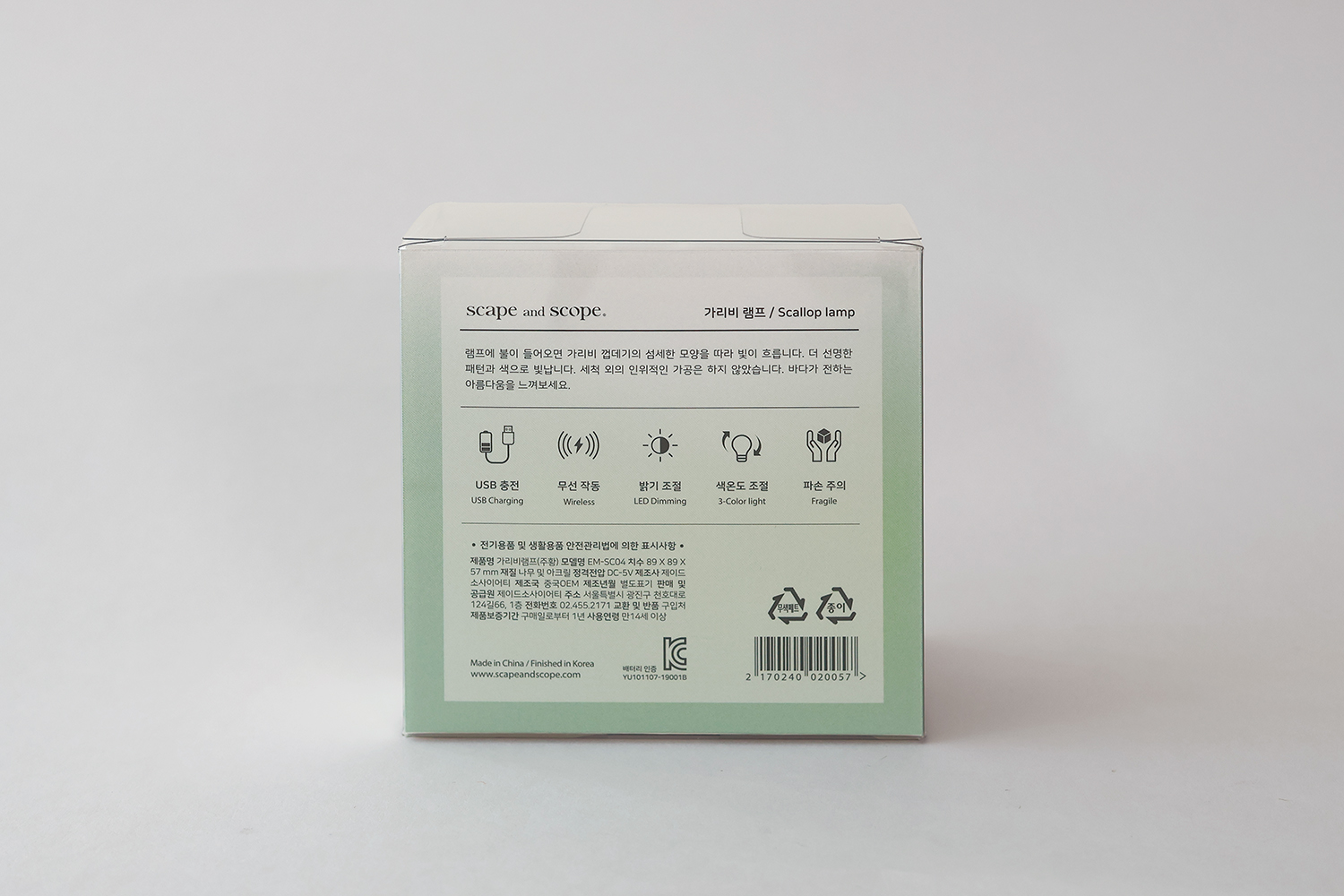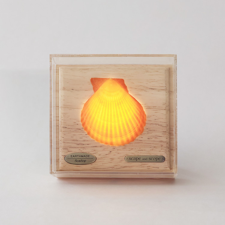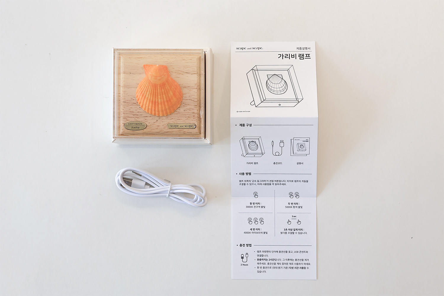 램프를 감싸고 있는 물체는 바로 우리가 잘 아는 '가리비'입니다. 램프에 불이 들어오면 가리비 껍데기의 섬세한 모양을 따라 빛이 흐릅니다.세척 외의 인위적인 가공은 하지 않았습니다. 바다가 전하는 아름다움을 느껴보세요.