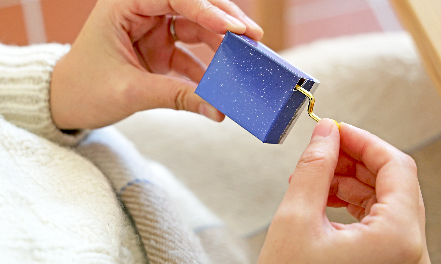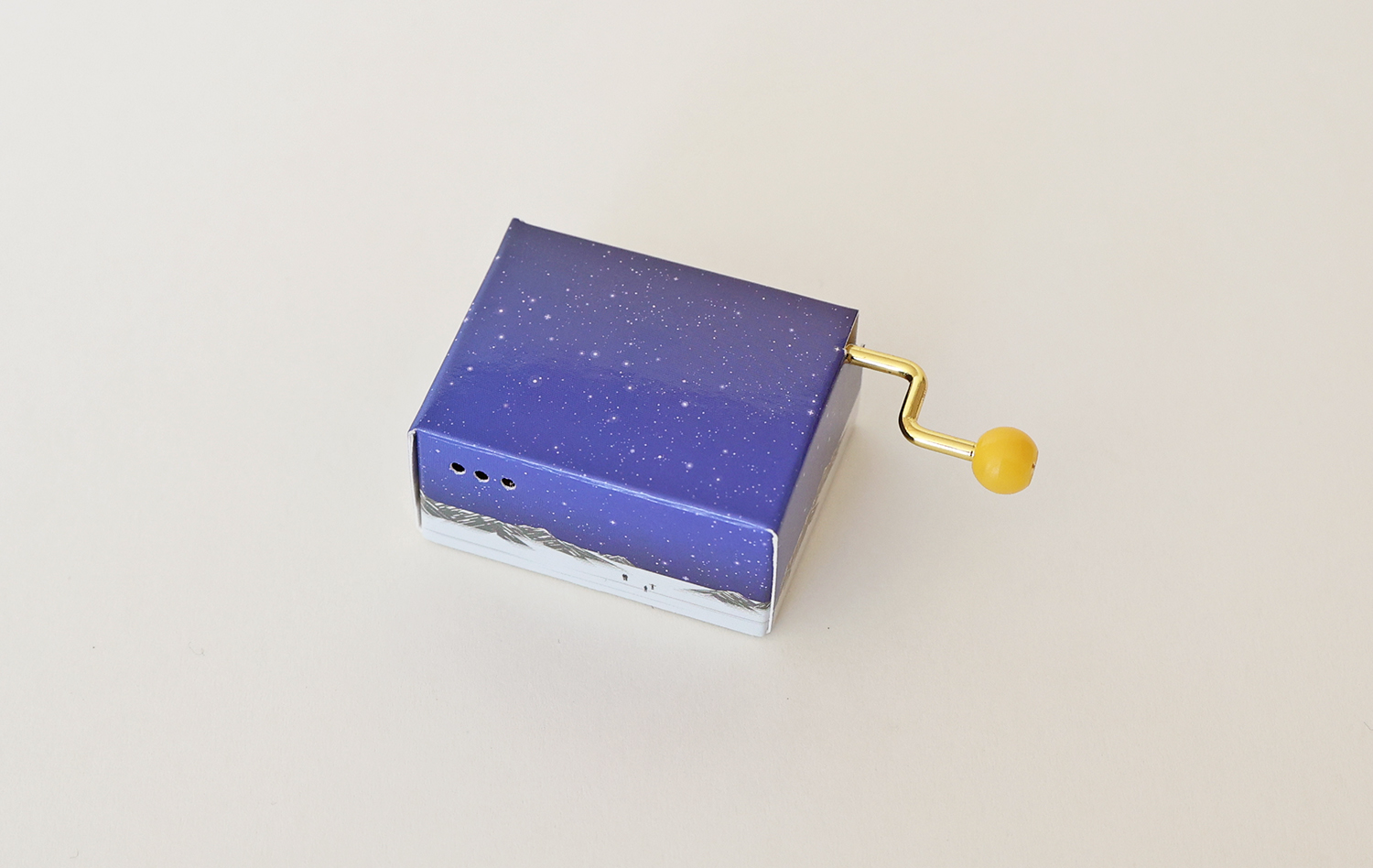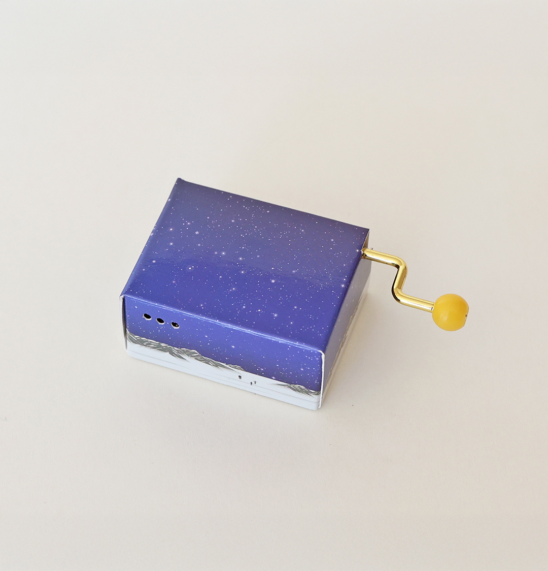 수동 뮤직박스입니다. 노란 손잡이를 돌리면 아름다운 멜로디가 흐릅니다. 맑고 투명한 소리와 평온한 풍경. 작은 상자에 편안함만 가득 담았습니다.