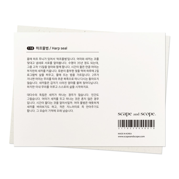 카드의 바탕이 되는 종이를 고를 때 우리가 가장 중요하게 생각한 것은 '촉감'입니다. 조금 거칠지만 자연스러운 질감이 살아있는 비도공지를 사용했습니다.