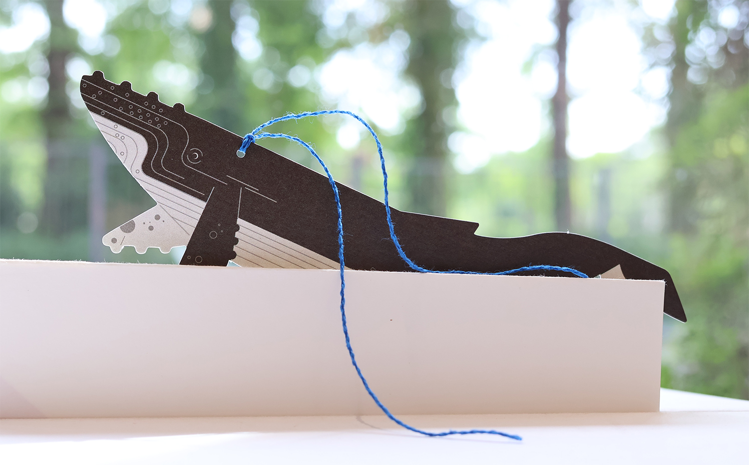 봉투를 대신해 사용할 수 있는 도톰한 종이를 함께 넣었습니다. 자세히 보면 중간에 책갈피를 끼울 수 있는 재단선이 있습니다. 여기에 고래를 끼워 물 속에 반쯤 넣어주세요! (수면 위로 빼꼼 올라오도록이요)
