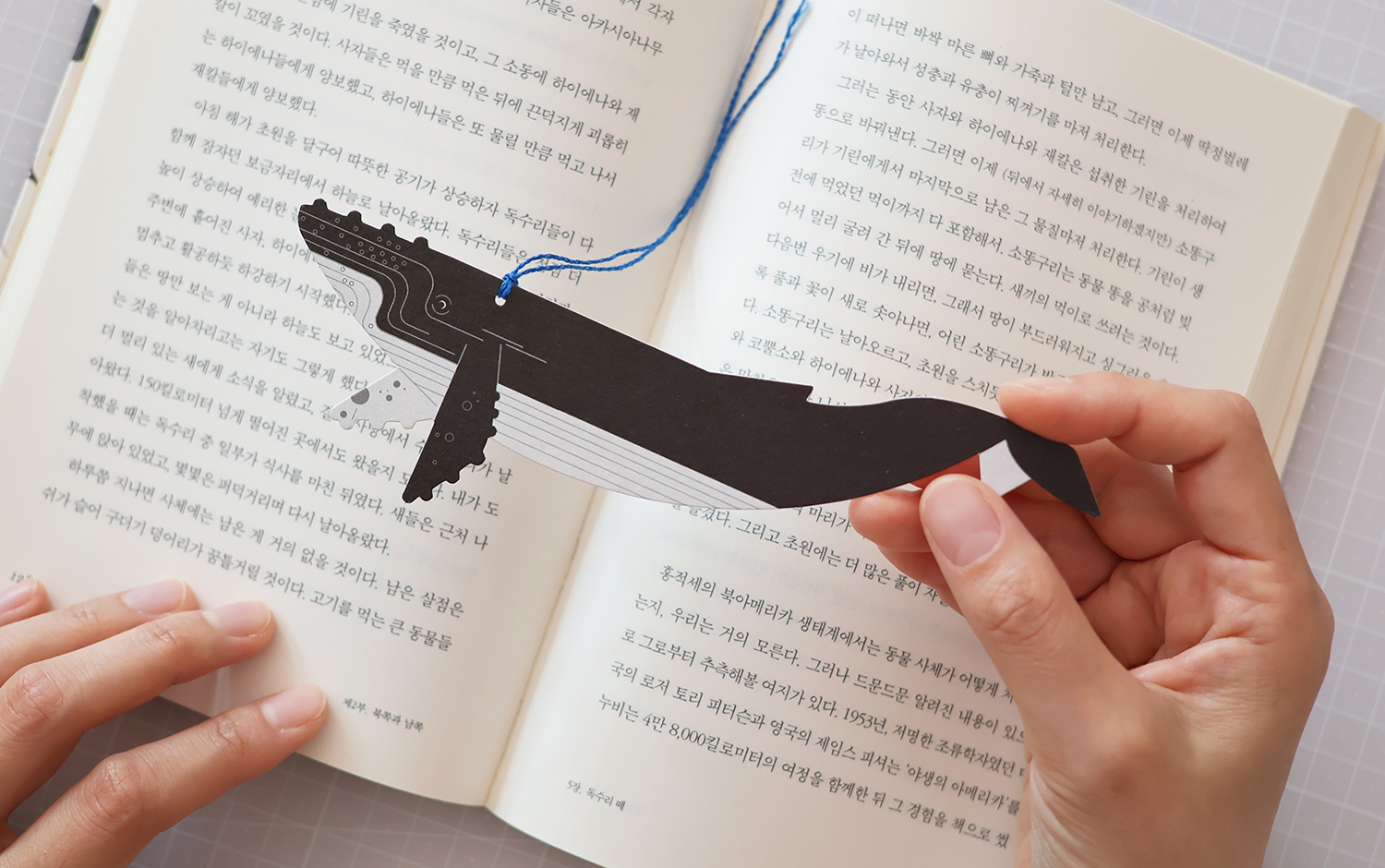 고래와 돌고래, 작은 풀들을 기본으로 물줄기와 풀줄기가 훌륭한 가름끈이 되었습니다. 분기공에서 뿜어오르는 시원한 물줄기와 싱그러운 풀줄기로 책을 가름해보세요. 독서의 시작과 끝에 작은 즐거움이 생겼습니다.
